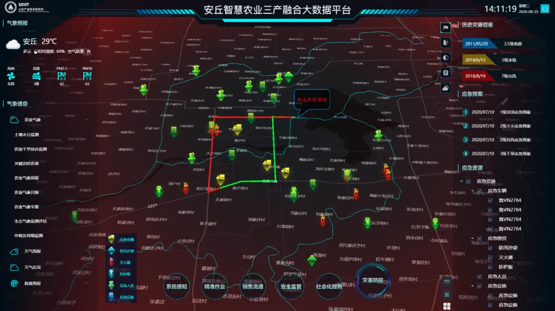 灾害防控专题应用具有灾前预警、灾中应急指挥、灾后损失评估等功能,是农业发展的重要保障。平台可接入气象部门发布的极端天气及农业灾害预警,并推荐数字化应急预案,为灾害救援做好充分准备。