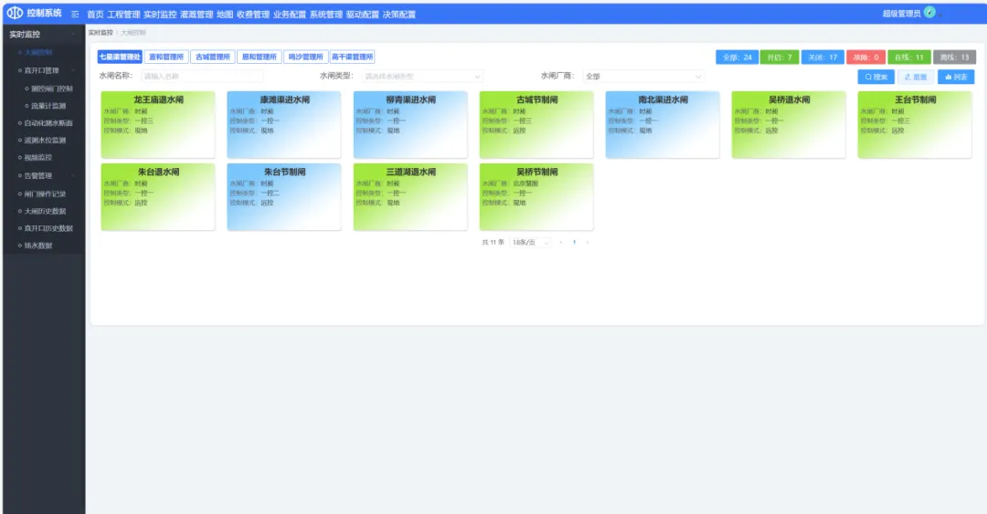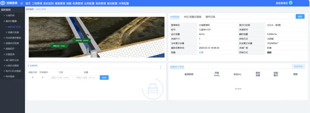 中科星图闸门控制系统,可实现灌区自动化设备与平台之间的高效、稳定通讯,有效解决了数据传输的实效性与稳定性难题。基于工业级通信协议,突破传统调控瓶颈,实现闸门启闭秒级响应与远程精准操控。系统集大闸控制、直开口管理、断面监测、遥测水位监测、视频监控、告警管理等功能于一体,结合全景视频监控与水力仿真预演,确保输水安全零失误,有力保障输水、供水质量,有效实现降本增效目标,树立行业精准调控标杆。