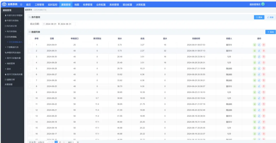 从引水计划编制到用水量核算,系统覆盖年度引水计划填报、年度引水指标、旬引水计划、旬引水指标、日引水指标、干渠断面引水、种植结构及面积、直开口定额水量、调度管理、退水、直开口实际用水量、灌溉日报等12项核心业务模块,通过与自动化设备实时数据深度融合,系统能够自动计算各管理所每日交接水及用水情况,极大简化了工作流程,提高了工作效率,确保灌溉管理工作高效、有序开展,开创了“数据跑腿、智能代劳”的灌区管理新范式。