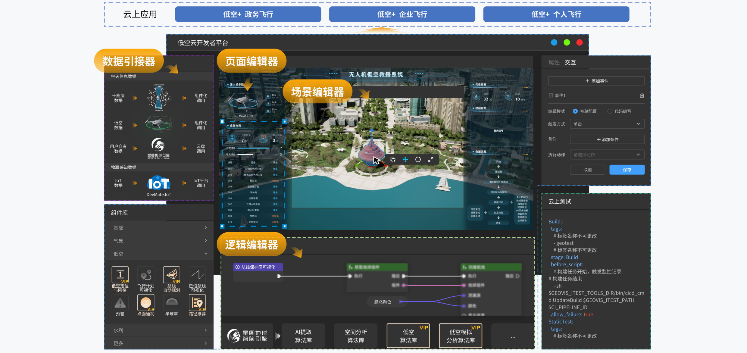 DevMate.LAC低空云开发者平台作为星图云生态体系中的核心开发中枢,深度融合星图云在低空领域的空天信息产业链多圈层能力,以及数字地球引擎、数字孪生引擎、AI 算法、低空物联网等关键技术,面向低空开发者构建统一集成、云端协同的可视化开发平台,提供覆盖低空数据开发、逻辑构建、服务管理与可视化呈现的全链路工具链。