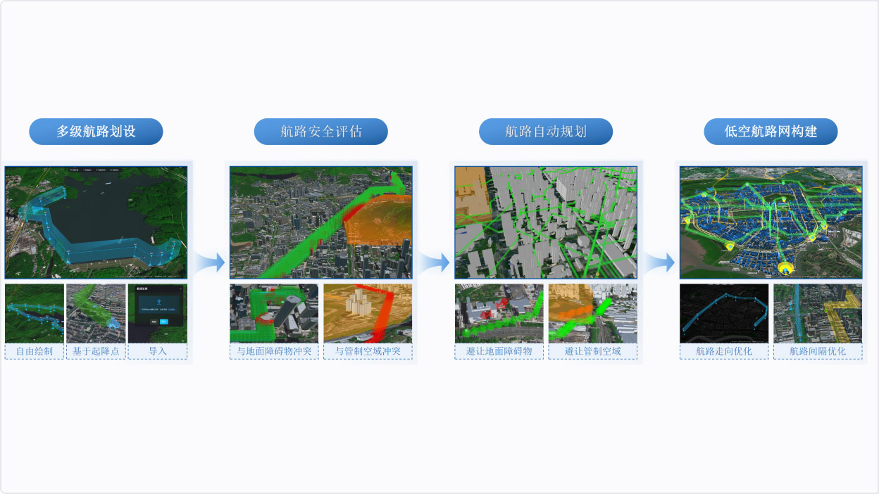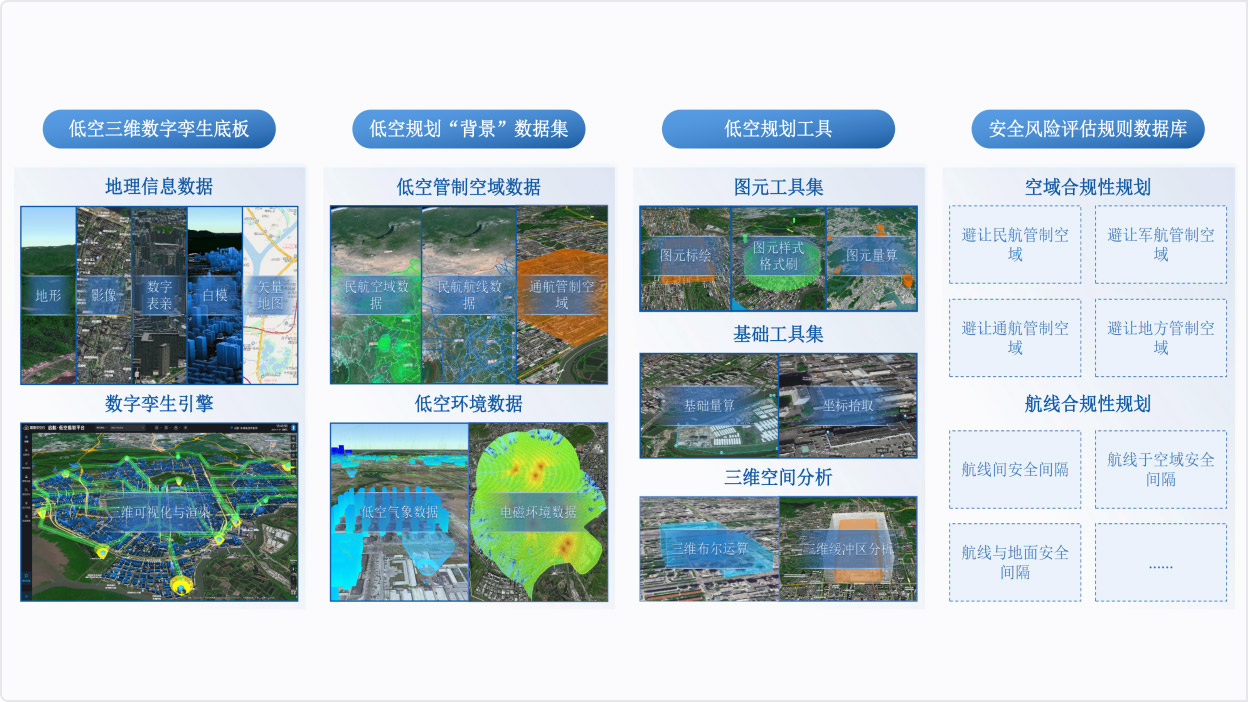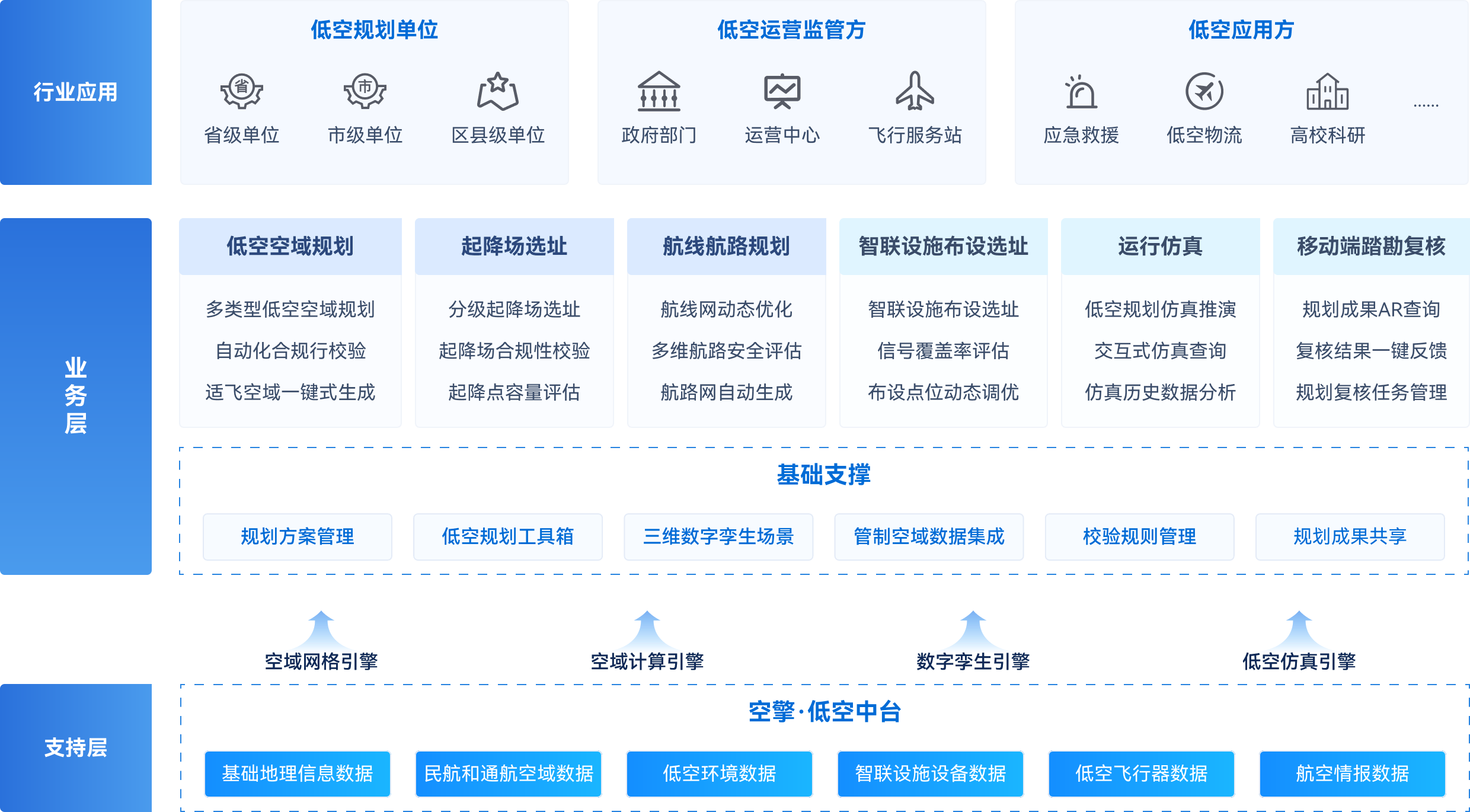 启航·低空规划平台,基于星图十圈层数据能力,依托低空中台空域网格、空域计算、数字孪生和低空仿真等核心引擎,构建一套从低空空域规划、起降场选址、航线规划、智联设施布设选址、运行仿真到线下踏勘全流程的低空综合规划体系。为低空规划单位、低空运营监管方及低空应用方提供一站式数字化低空规划工具。