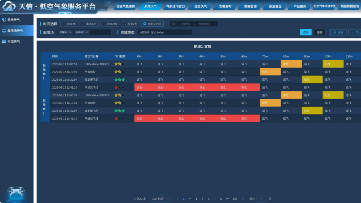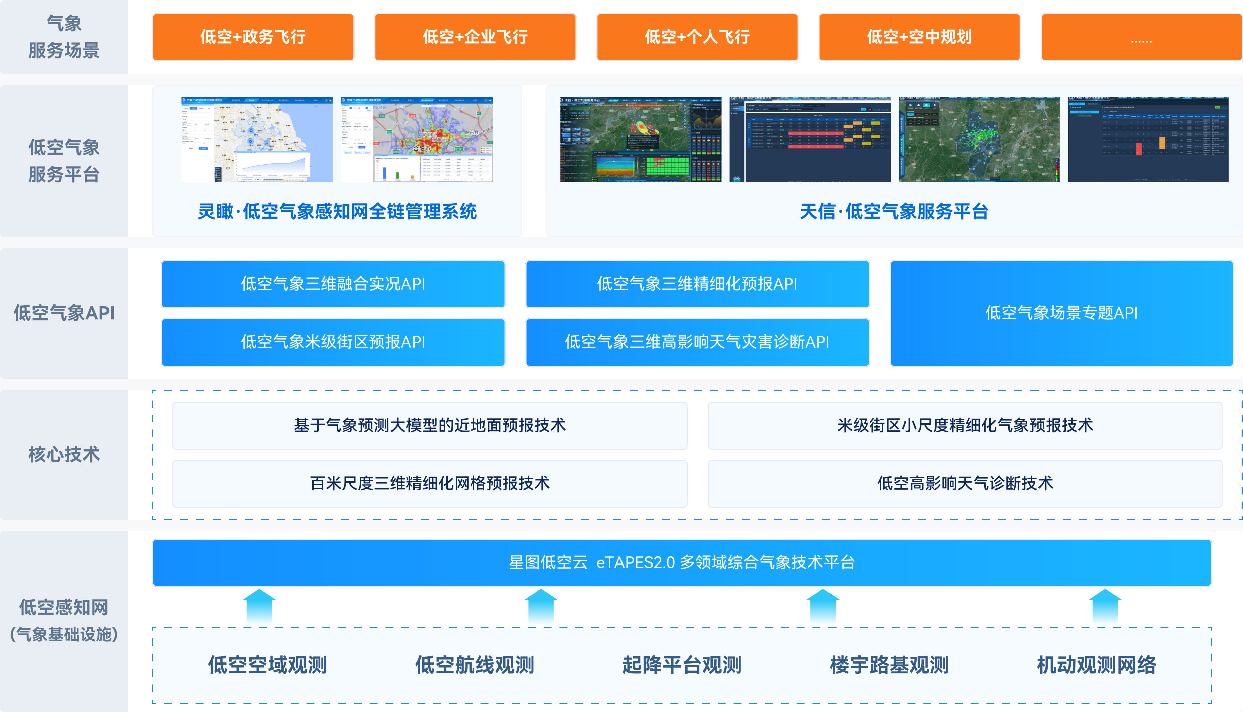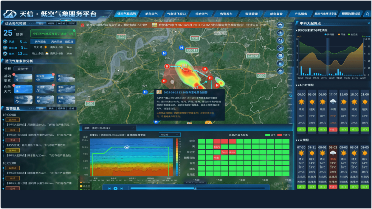 天信·低空气象服务平台依托空天地一体化的立体监测网络,深度融合气象、飞行与行业等多源数据,实现了从宏观空域到微观航线的精细化监测预警。同时,平台全面融入中科星图低空规划、安全保障、协同监管、运行服务与场景应用五大平台体系,构建起覆盖低空活动全链条的一体化气象保障,为各类低空应用提供精准可靠的气象保障。推动低空飞行从“飞得起来”向“飞得安全”跨越,为蓬勃兴起的低空经济产业筑牢坚实可靠的气象安全防线。