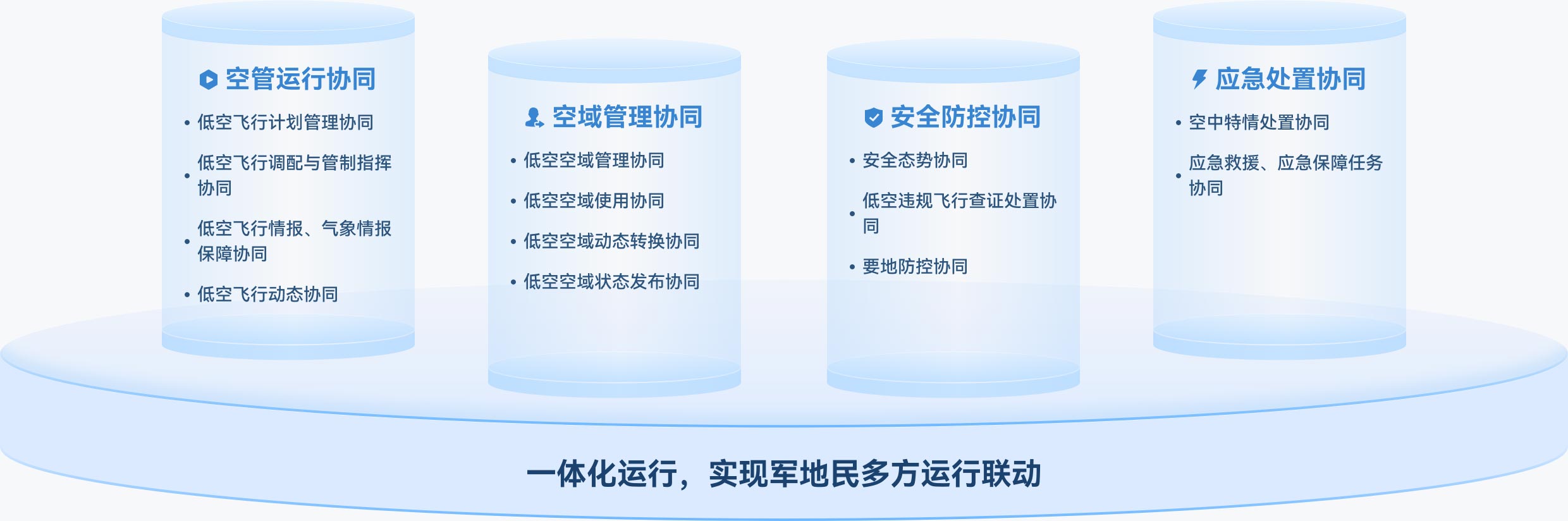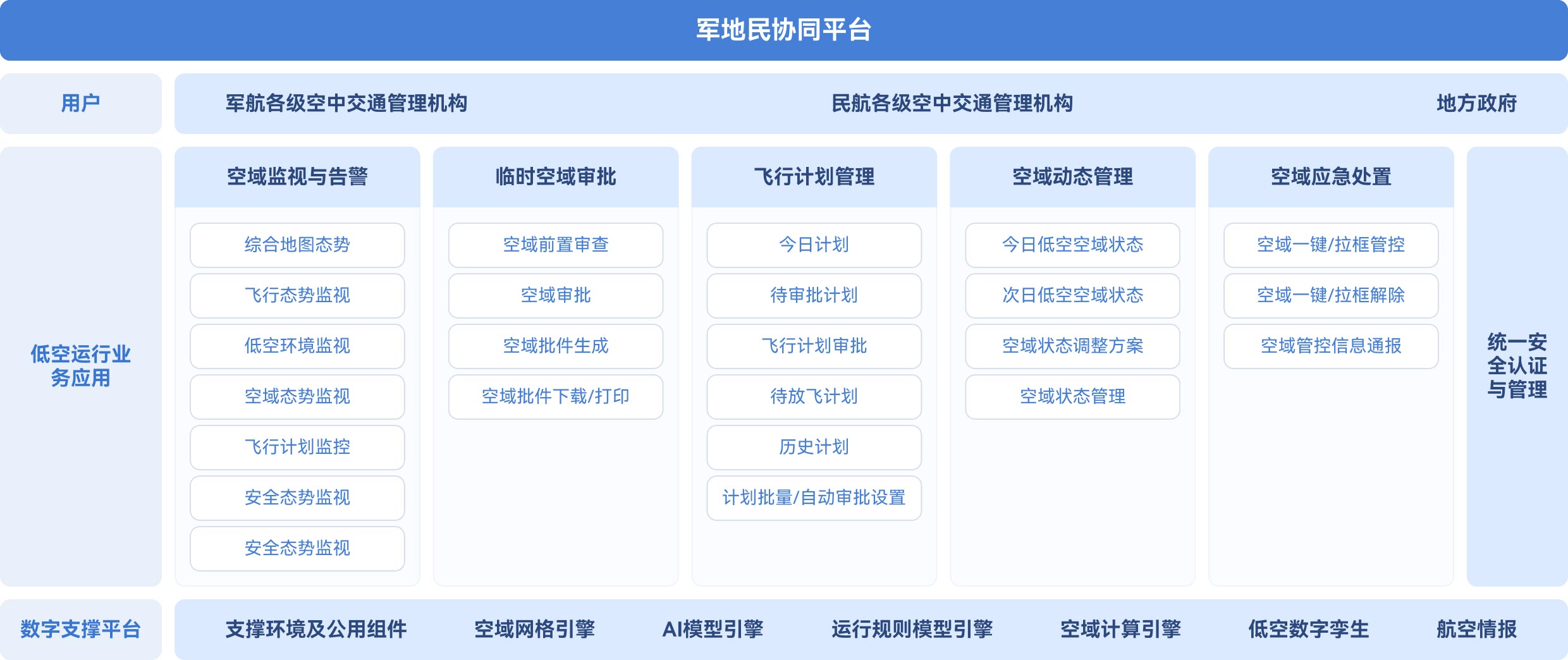军地民协同平台聚焦低空空域管理核心需求,打通军、地、民三方协同壁垒,遵循统一指挥、协同配合的原则,实现空管运行、空域管理、安全防控、应急处置四大维度高效协同,为城市低空空中交通管理改革提供坚实技术支撑,推动低空经济安全有序发展。
