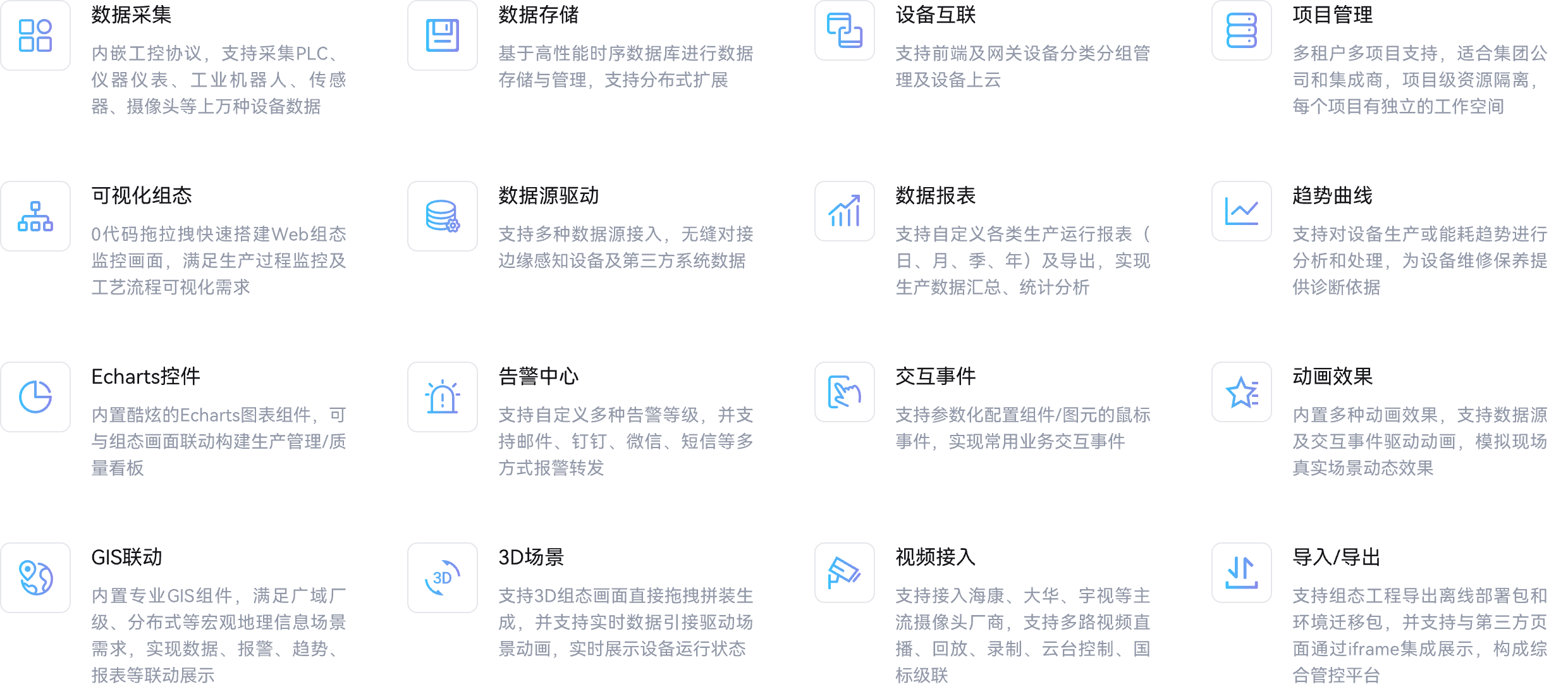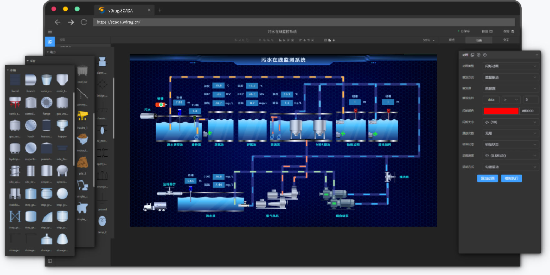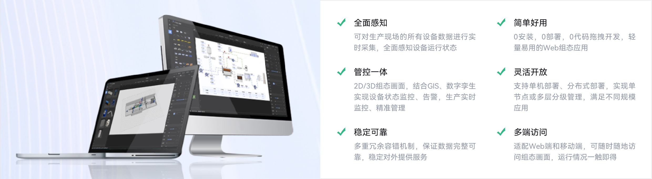 Dev.SCADA注是Web端的数据采集与监控组态软件,可提供从边缘感知设备到云端的数据采集、存储、分析、可视化等服务,实现生产工艺流程仿真、设备运行状态监控、数据报表、趋势分析、报警管理等功能,为安全生产、调度、管理、优化和故障诊断提供支撑;可集成GIS、数字孪生、视频等,构建基于数字孪生的生产实时管理驾驶舱,为企业生产自动化、数字化及管控一体化管理提供支撑。
