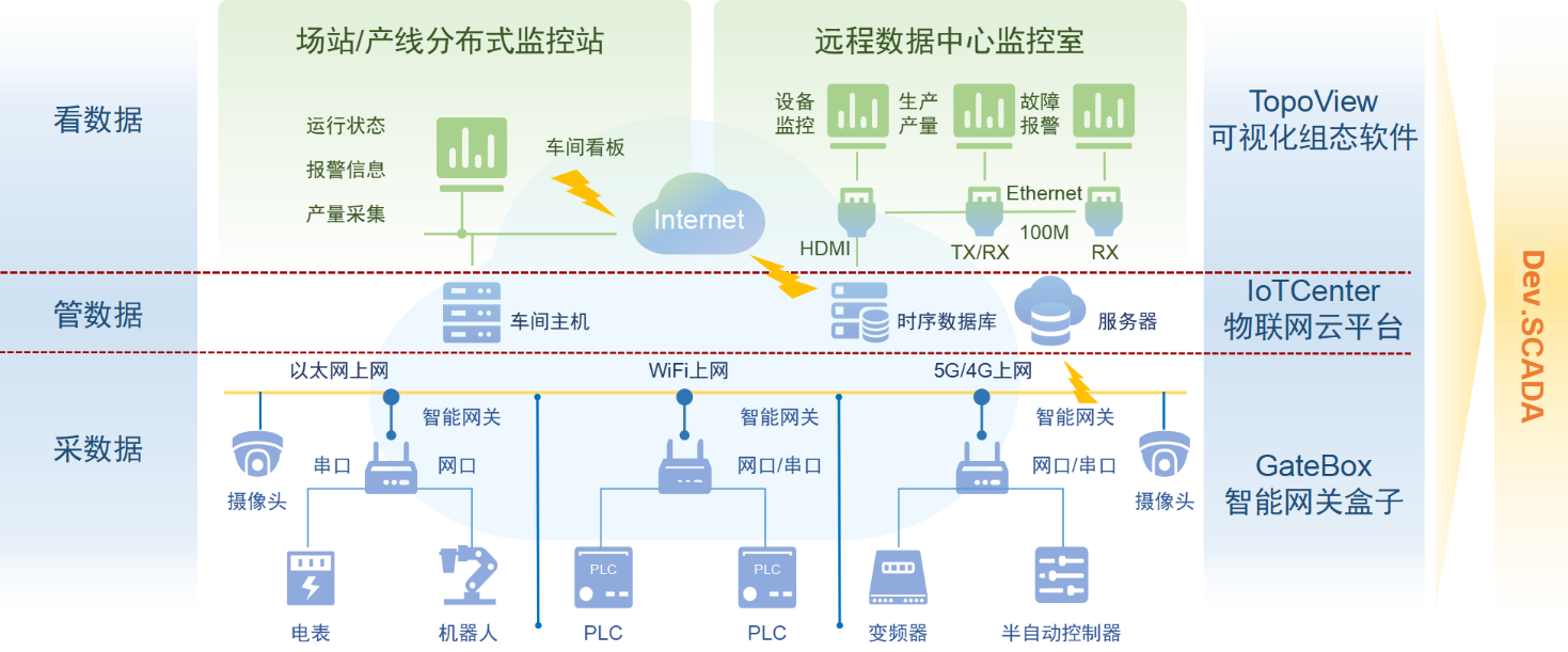 按照采数据、管数据、看数据三层架构,Dev.SCADA整体由3部分构成,分别为数采硬件:智能网关盒子 GateBox,数管云平台:物联网云平台IoTCenter,前端可视化:可视化组态软件TopoView,整体涵盖从现场监控站到调度中心,提供完整的生产信息采集与集成服务,可与本公司数字孪生产品集成,形成工厂/产线数字孪生整体解决方案,为企业安全生产保驾护航。