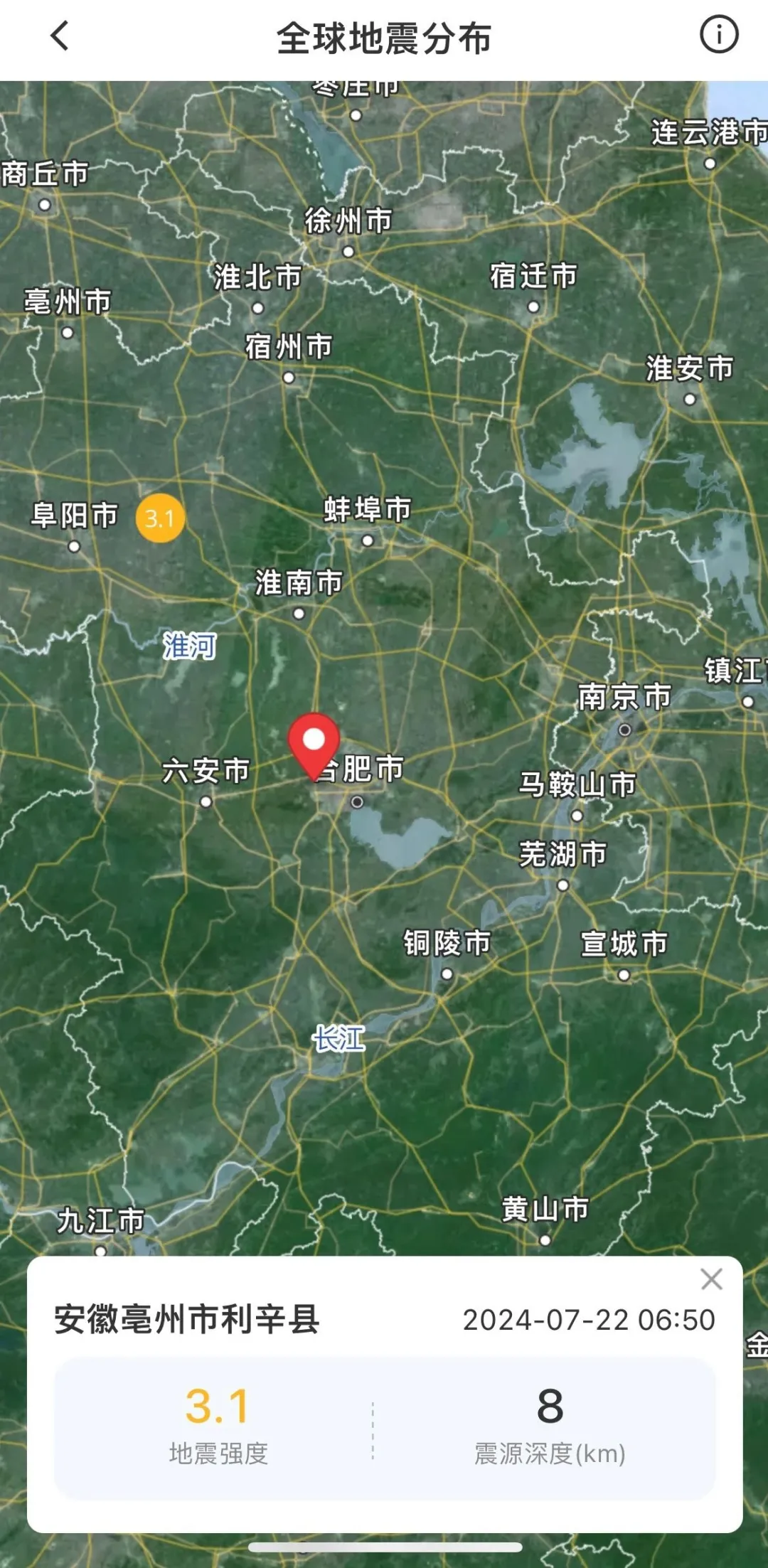 用户进入APP后,点击左上角第二个图标即可看到全球地震分布,查看详尽的地震信息(震级、发震时刻、深度和参考位置),点击具体位置可直接跳转到对应地点查看。