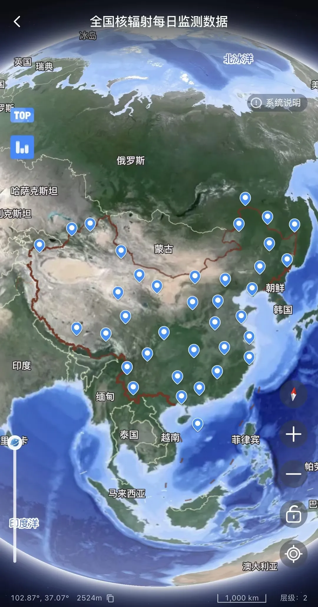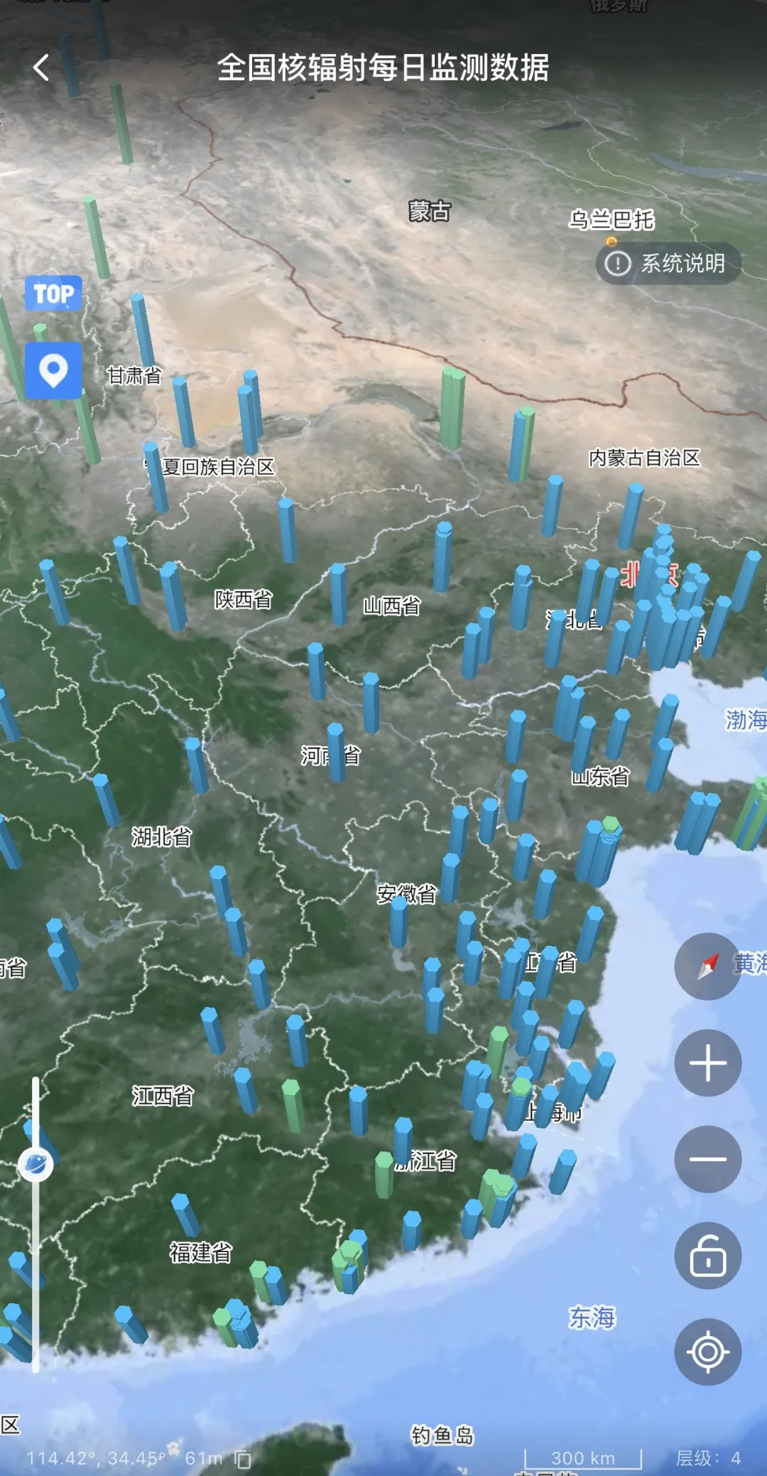 02核辐射监测核辐射监测在一定程度上已经成为保障公共安全与生态平衡的坚实防线。为方便大家了解核辐射问题,星图地球APPV1.3.8版丰富了【全国核辐射每日监测数据】功能。