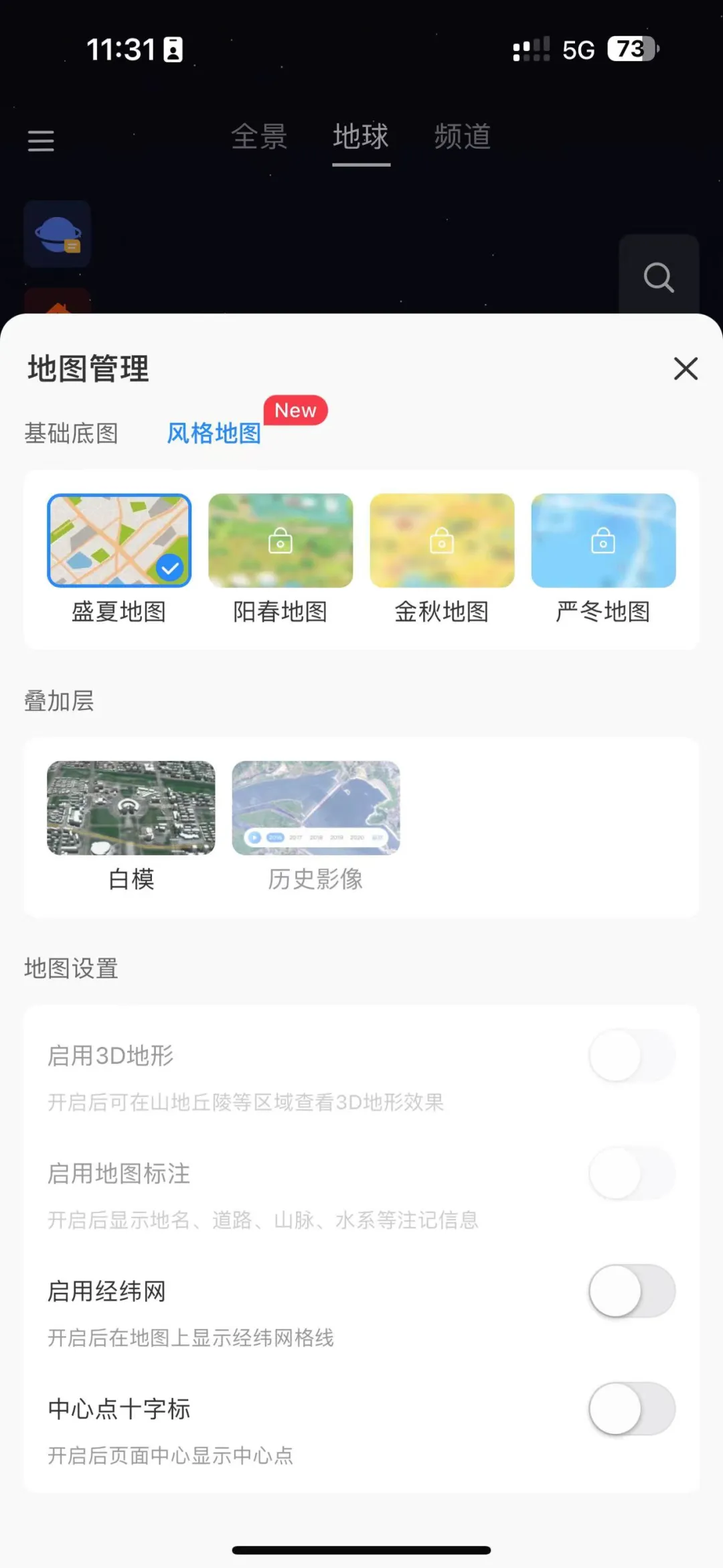 03风格地图四季如诗,春花绽放生机盎然,夏风轻拂绿意满园,秋叶飘黄硕果累累,冬雪纷飞银装素裹。除了用肉眼感知四季的变化外,星图地球APPV1.3.8版也特意上新了【风格地图】功能。