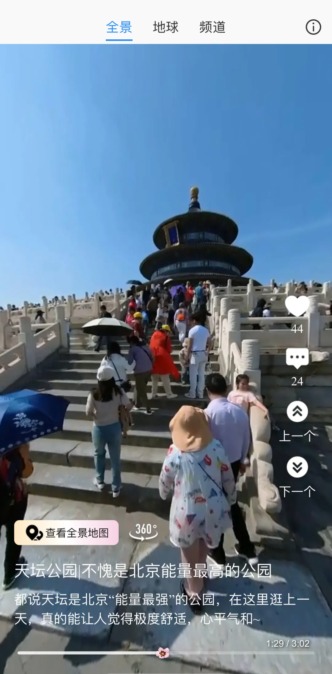 点击屏幕顶端的【全景】即可进入全景视频,星图地球APP期待与大家共赏世界美景,探索奇妙世界。