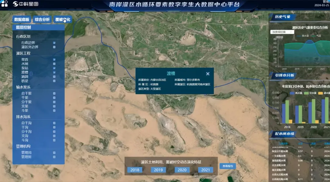 南岸灌区水循环要素数字孪生大数据中心平台充分融合了星图云开放平台在感知信息采集、水利大数据处理、专业模型开发和知识平台构建方面的核心能力,基于土地利用动态分析模型分别从程度、数量和类型转移三个方面研究近 10年灌区的土地利用、覆被时空动态演化特征,构建以环境要素数据(降水、蒸散发、气温、径流)、灌区基础数据(引水量、排水量、渠系建筑物)、实时监控数据为基础的多维度数字底板,为数字灌区的建设提供支撑。