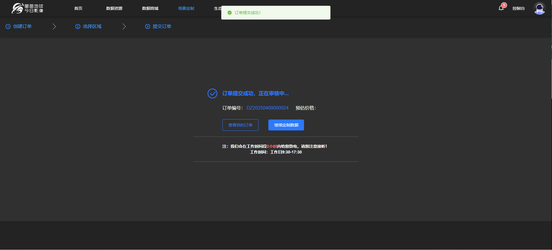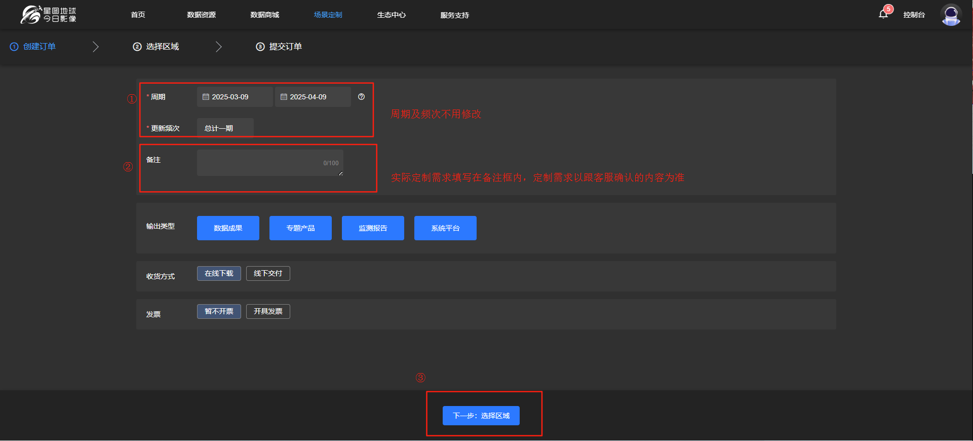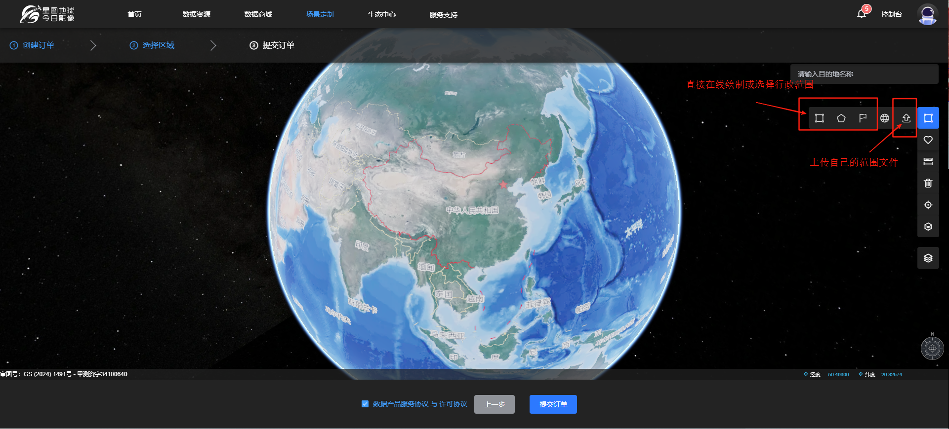 选择区域,如有实际需求的范围文件可直接上传,或直接在线绘制,不影响实际交付。选择区域完成后,点击【提交订单】