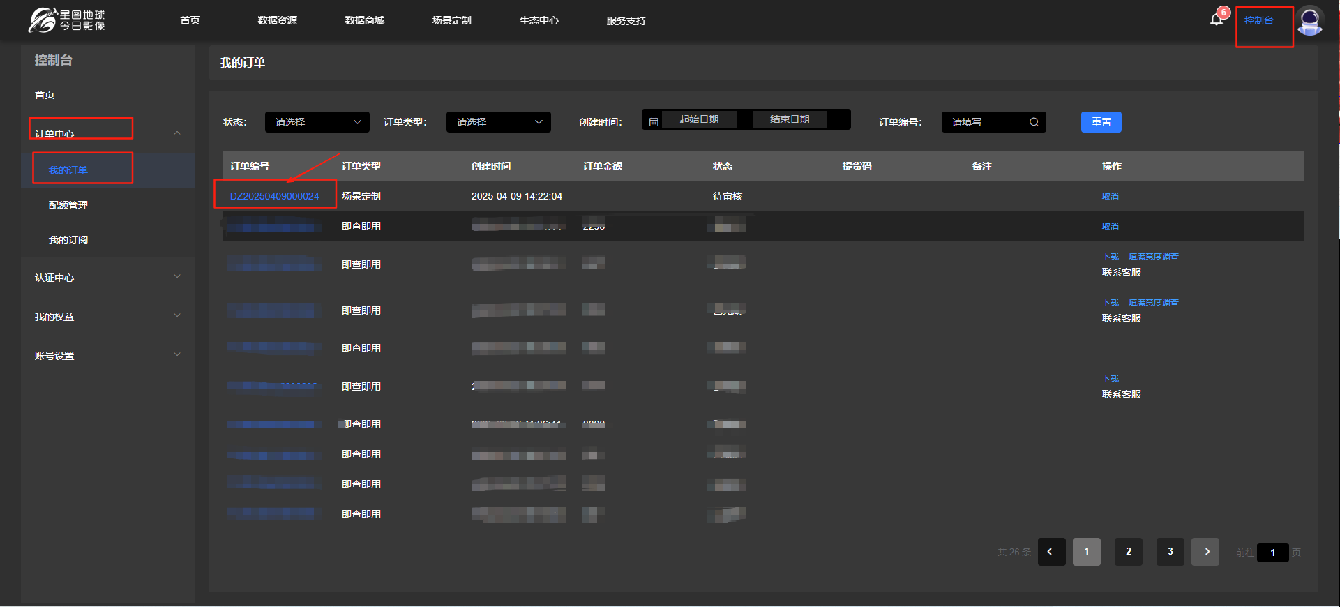四、订单审核完成后,按前述路径:登录【星图云开放平台】→【星图云】→【星图地球今日影像】→【控制台】→【订单中心】→【我的订单】,点击定制订单号(蓝色字),进入订单详情页,完成订单支付即可。