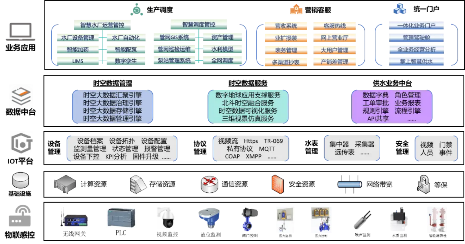 星图亿水基于成熟技术线结合行业业务线规划智慧供水的典型系统架构,可涵盖大部分项目需求,为管理单位及运营企业提供菜单式功能清单,且采用兼容性、适配性高的平台化架构设计,可以根据实际业务需求及未来业务变更做定制化开发快速部署。