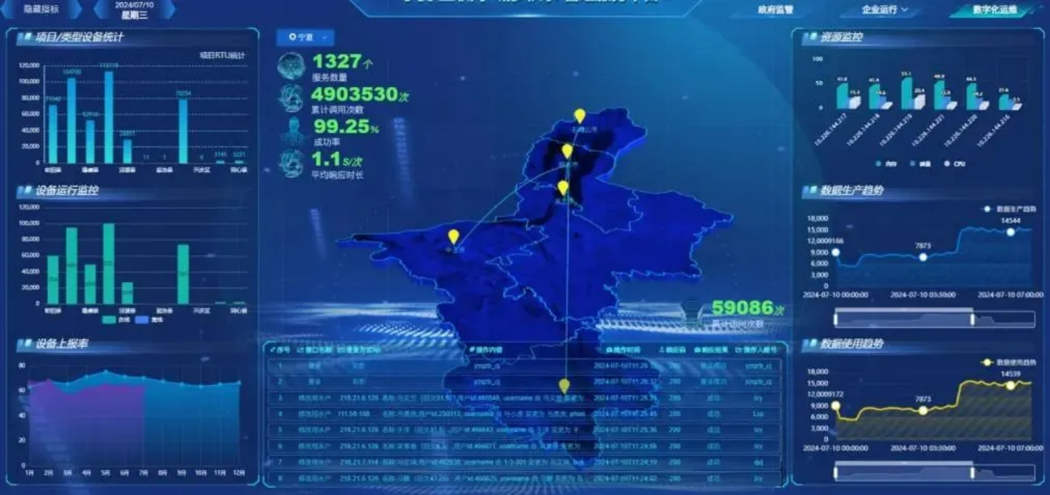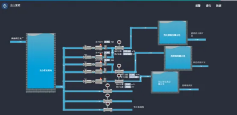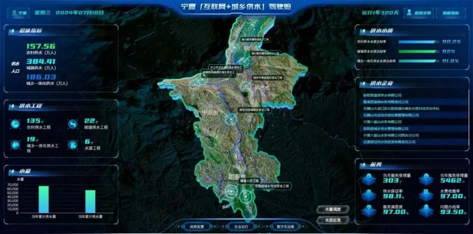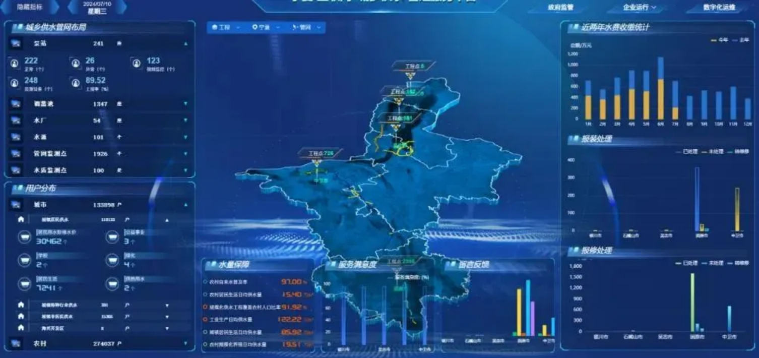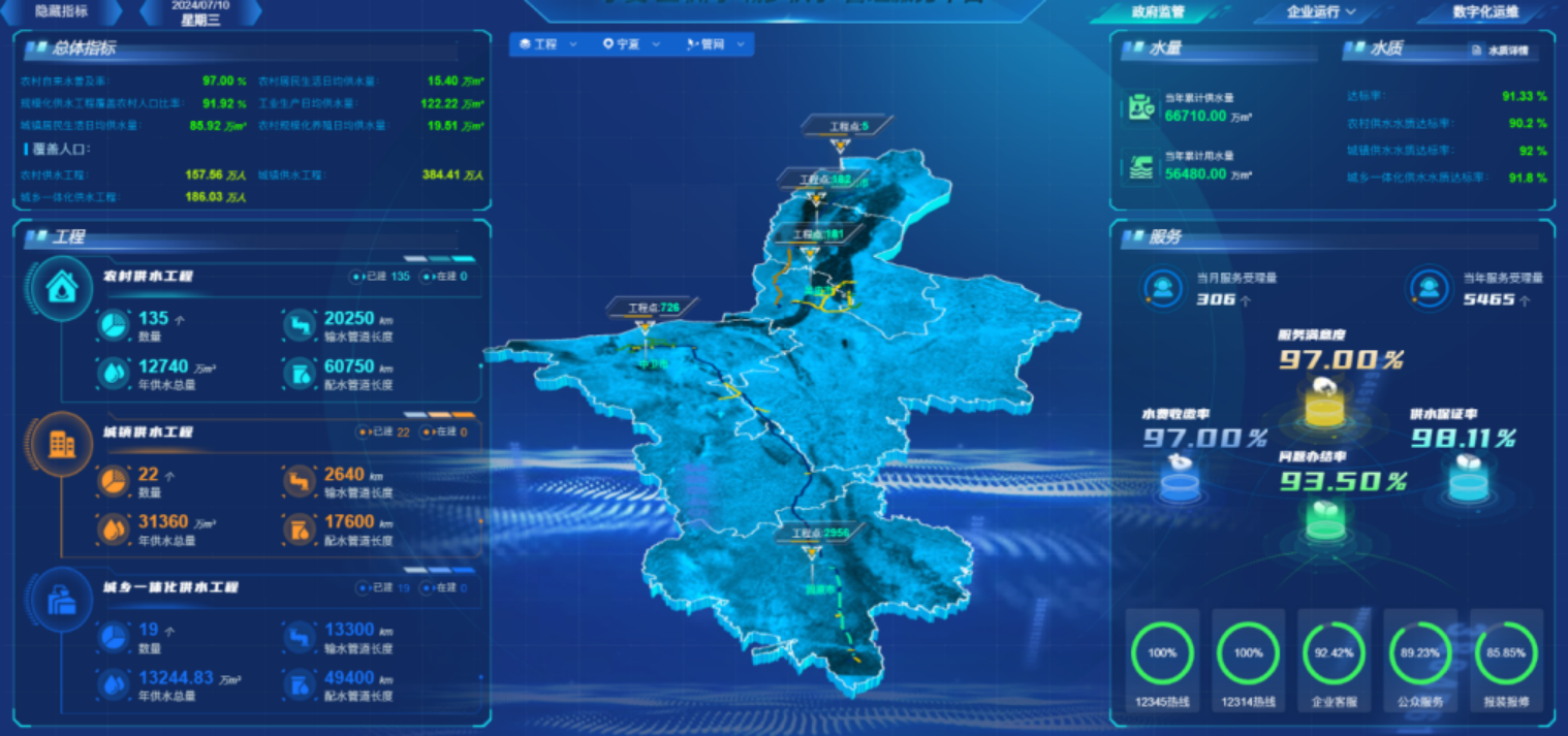 从源头到龙头的全过程管理,建立省市县主管、统管、运管三位一体,通过一库、一图、一网,一驾驶舱实现对水源地监管、水厂、管网运行状态监管、供水量计收等等。