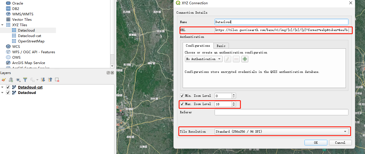 https://tiles1.geovisearth.com/base/v1/img/{z}/{x}/{y}?format=webp&tmsIds=w&token=用户的token(2)Max Zoom Level: 目前 数据云的影像图最大支持18级,填入18