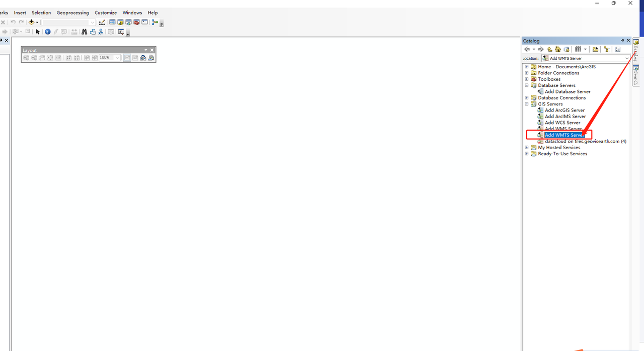 1. 打开【ArcMap】客户端,如下图,再右侧栏中找到WMTS Server,点击添加WMTS Server