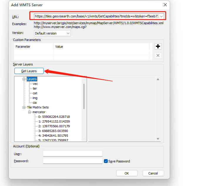 2.填入元数据查询地址,其他项保持默认;点击Get layers查看是否成功获取图层信息,之后点击ok。