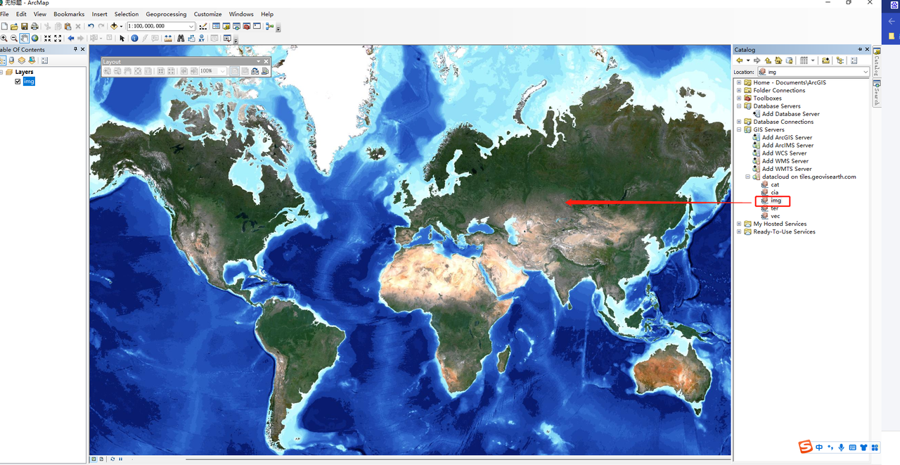 3.在右侧的WMTS server中找到datacloud服务,将对应图层拖拽至Map中即可。