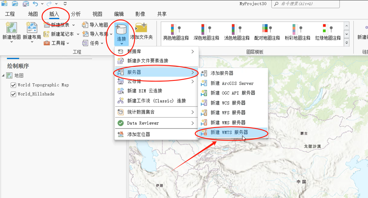 1. 打开【Arcgis pro】客户端,如下图,再导航栏中找到插入-连接-服务器-新建WMTS服务器,点击新建WMTS服务器