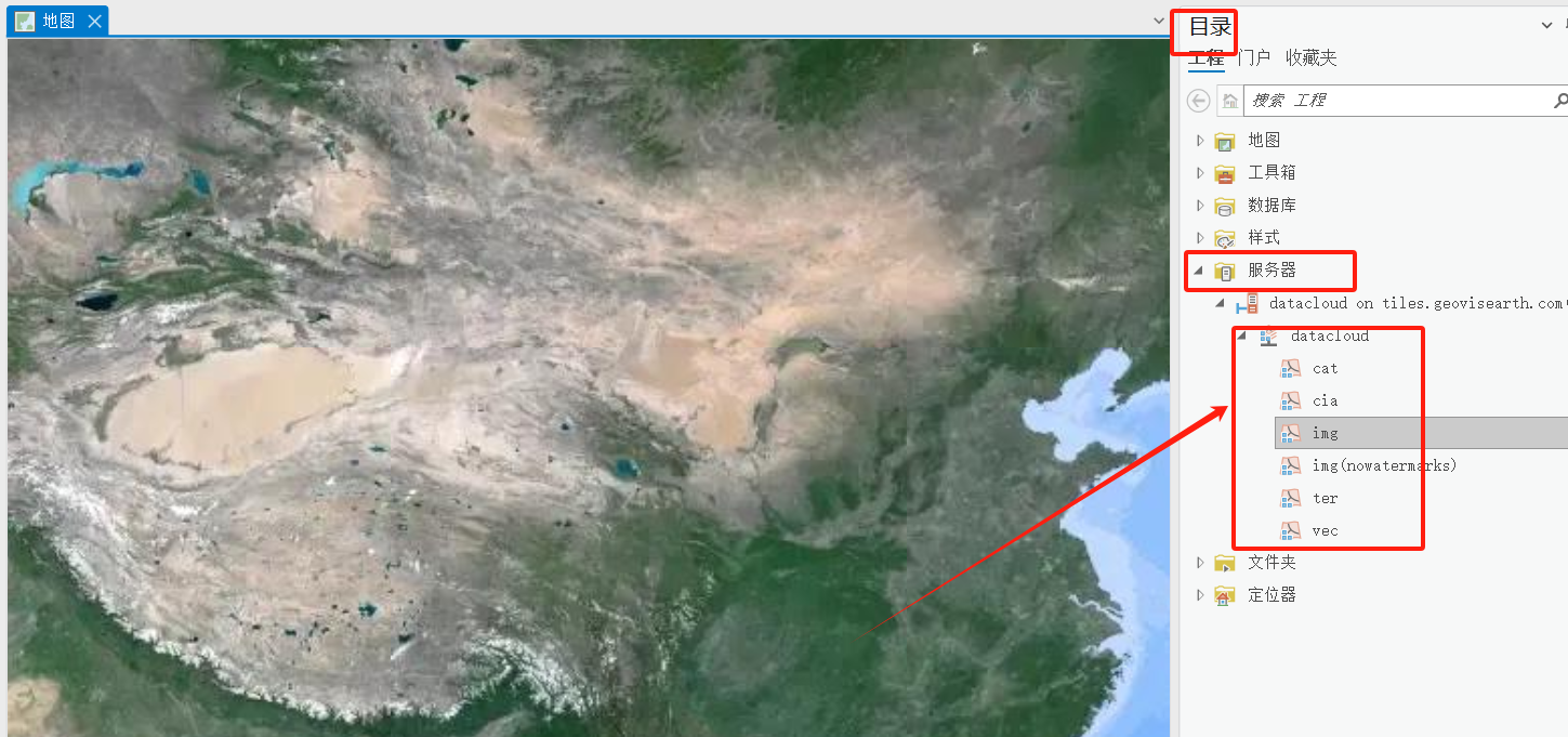 3.在右侧目录窗口中找到【服务器】-【datacloud服务】,将对应图层拖拽至左侧地图中即可。