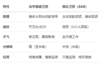 特点:主动发射微波,不受光照和天气影响(全天时、全天候),可穿透云层、雾霾甚至浅层植被/土壤。对地表形变、水分、粗糙度敏感,但数据解译较复杂。