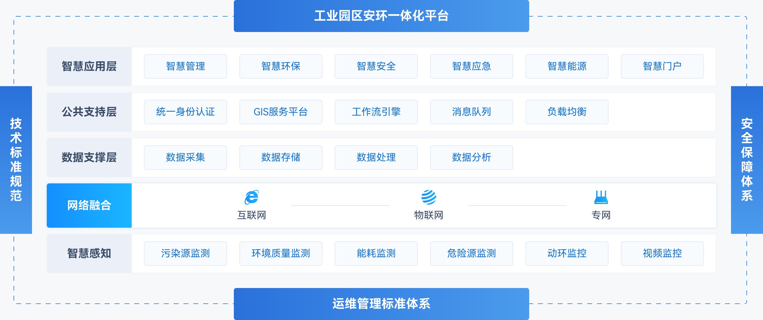 基于大数据分析、数据视频两网融合等先进技术理论,采集园区安全生产、环境保护、消防应急等业务管理信息或相关系统数据,打通不同业务场景及系统之间数据壁垒,建设园区综合一体化管理平台,为园区企业提供完善的配套支持体系,提高园区的经济运行管理能力、办公协作效率,加强园区生产运行的管控力,支撑园区分析决策,有效提升园区规范化、智能化管理服务水平,进一步提升园区的综合竞争力。