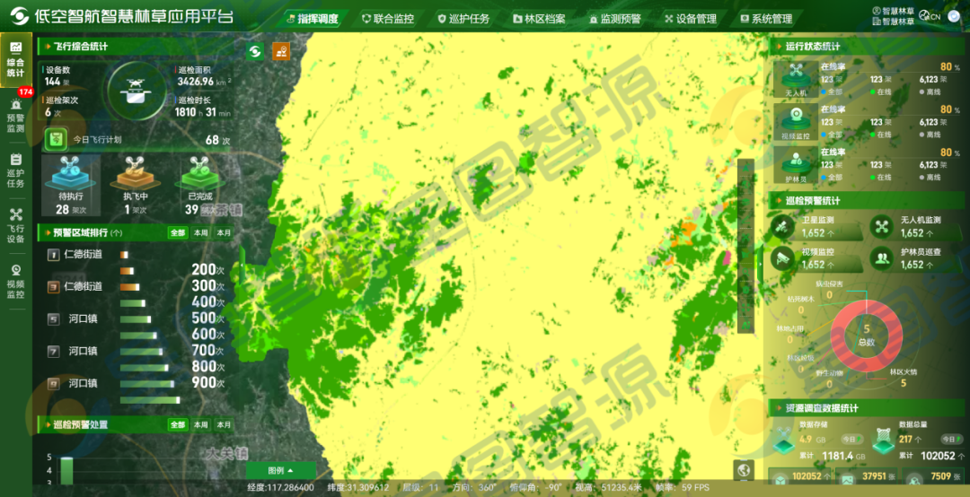 平台实现了对全域无人机资源的集中管控与智能调度,系统可根据任务优先级、空域条件、设备状态,自动规划最优航线,实现多类林草巡检任务并行执行。
